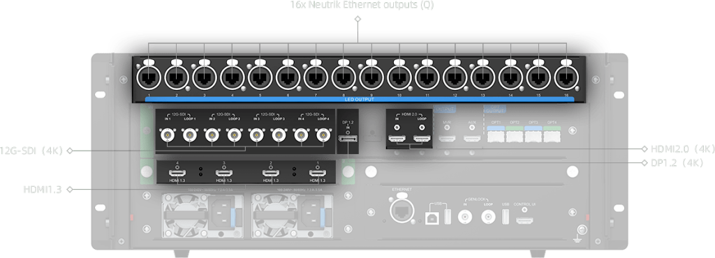16x Neutrik Ethernet outputs (Q), single unit loading capacity of 10.4 million pixels